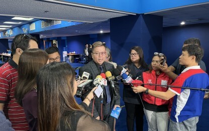 BIDDING. Commission on Elections (Comelec) spokesperson John Rex Laudiangco answers questions from the media during the opening of bids for the electronic transmission system to be used in the 2025 midterm polls at the Comelec main office in Intramuros, Manila on Thursday (Feb. 29, 2024). The poll body has declared two firms as eligible to bid for the project. (Ferdinand Patinio/PNA)