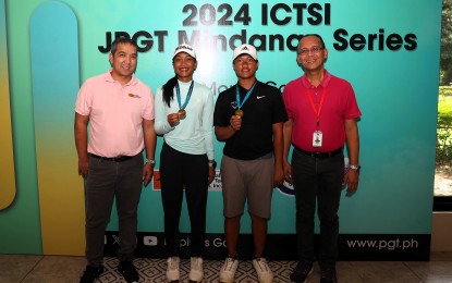 CHAMPIONS. Zero Plete (2nd from left) and Alexis Nailga (3rd from left) display their medals after ruling the 13-15 age category of the ICTSI JPGT Mindanao Series 3 at Del Monte Golf Club in Bukidnon on Thursday (Aug. 8, 2024). With them are ICTSI's Ronnel Javier (left) and Del Monte Senior manager and Del Monte Jungolf chairman Robert Sindol (right). (PNA)