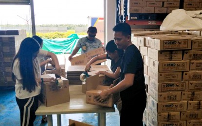 FOR FLOOD VICTIMS. Volunteers help pack relief items for families affected by Typhoon Enteng flooding at the Department of Social Welfare and Development (DSWD) warehouse in Palo town, Leyte province on Sunday (Sept. 8, 2024). DSWD has already distributed 45,333 family food packs to families affected by the typhoon in three Samar provinces. (PNA/DSWD Region 8)