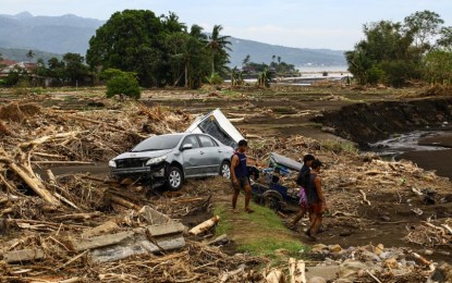 TYPHOON-WEARY. Residents walk past a damaged car and tricycle in Barangay Poblacion 3, Laurel, Batangas on Oct. 29, 2024. The Bugaan Bridge, which connects Barangay Poblacion 3 and Barangay Bugaan East, was destroyed following torrential rains caused by Severe Tropical Storm Kristine (international name Trami) on Oct. 24, 2024. (PNA/Joan Bondoc)