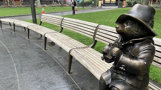 Statue of Paddington eating a sandwich in Leicester Square, London. (Matt Brown)