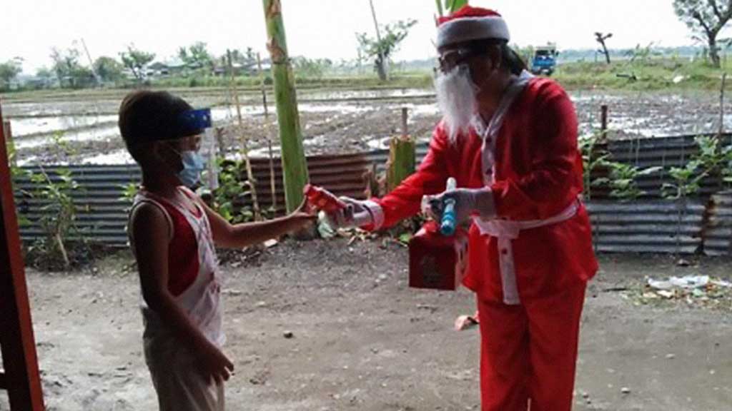 MY TEACHER, MY SANTA CLAUS. Roselle del Rosario Mananggit, a Grade 2 teacher of Mangino Elementary School in Gapan City, Nueva Ecija, plays Santa Claus to her pupils as a way of rewarding them for diligently answering their learning modules. She said she wants the children to feel the spirit of Christmas amid the Covid-19 pandemic. (PNA/Roselle del Rosario Mananggit)