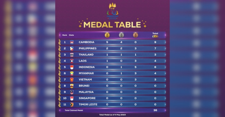 The Philippines placed second behind host Cambodia in the medal tally of the 32nd Southeast Asian Games as of May 4, 2023. (Photo courtesy of Cambodia 2023 Facebook page)