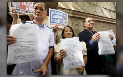 PETITION. ACT Party-list Rep. France Castro (center) files a petition for review the Quezon City Prosecutor's Office ruling last month, which thumbed down the grave threats complaint filed against former president Rodrigo R. Duterte at the Department of Justice building in Manila on Monday. (PNA)