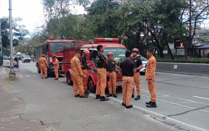 ON ALERT. Bureau of Fire Protection officers responding to bomb threats are on standby along Visayas Avenue in Diliman, Quezon City on Monday (Feb. 12, 2024). The Department of Environment and Natural Resources and Philippine Information Agency buildings received the threats which turned out to be hoaxes. (Raquel Bonustro/PNA)