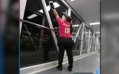 STEP UP. A janitorial services employee cleans the glass windows at the airport in this undated photo. The Manila International Airport Authority is in charge of their contracts, even when the private operator comes in, MIAA acting general manager Eric Ines said. (PNA/NAIA Facebook)