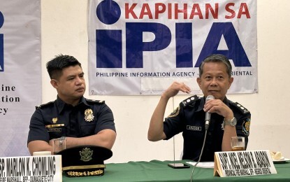 FORUM. Dumaguete City fire marshal Chief Insp. Marlon Chomling (left) and Negros Oriental provincial fire marshal Supt. Noel Nelson Ababon present data during a forum on Wednesday (March 13, 2024) as the country commemorates Fire Prevention Month. At least 64 fire incidents were already recorded this year. (Mary Judaline Flores Partlow/PNA)