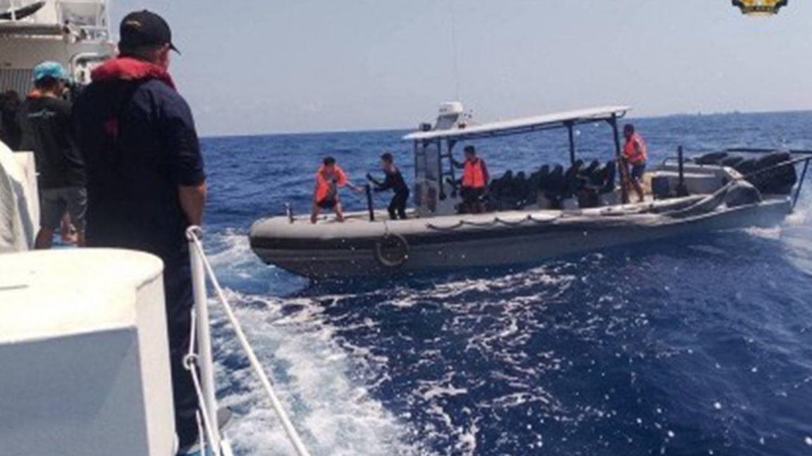 RESUPPLY MISSION. Philippine Navy soldiers transfer essential cargoes from Unaizah May 4 and BRP Cabra to the BRP Sierra Madre off Ayungin Shoal on Saturday (March 23, 2024). The resupply boat Unaizah May 4 was damaged by yet another water cannon attack by the Chinese Coast Guard. (PNA/AFP)