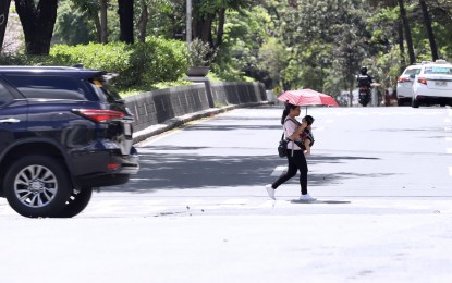 PROTECTED. A mother uses an umbrella to shield her toddler from the afternoon heat as they cross the intersection of Senator Miriam P. Defensor-Santiago and Quezon Avenues in Quezon City on Black Saturday (March 30, 2024). The heat index level in the city reached the "extreme caution" level of 38 to 39 degrees Celsius during the weekend. (Robert Oswald Alfiler/PNA)