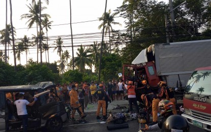 MISHAP. Seven persons, including a 2-year-old girl, died when a passenger van and delivery truck collided in Sariaya, Quezon, early Sunday morning (Aug. 18, 2024). Eight others were hurt in the accident. (PNA/Janine Garcia)