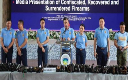 SEIZED FIREARMS. Brig. Gen. Paul Kenneth Lucas, director of Police Regional Office (PRO)-Calabarzon, presents to the media the results of the intensified campaign against loose firearms from Jan. 1 to Aug. 31, 2024 at Camp Vicente Lim in Calamba City on Tuesday (Sept. 3, 2024). He said the operations netted 2,929 firearms, of which 991 were confiscated and 1,938 were for safekeeping. (PNA)