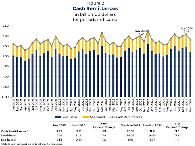 Of the personal remittances from OFs, cash remittances coursed through banks reached US$2.81 billion in November 2024, higher by 3.3 percent than the US$2.72 billion posted in November 2023.